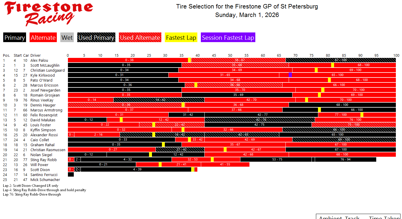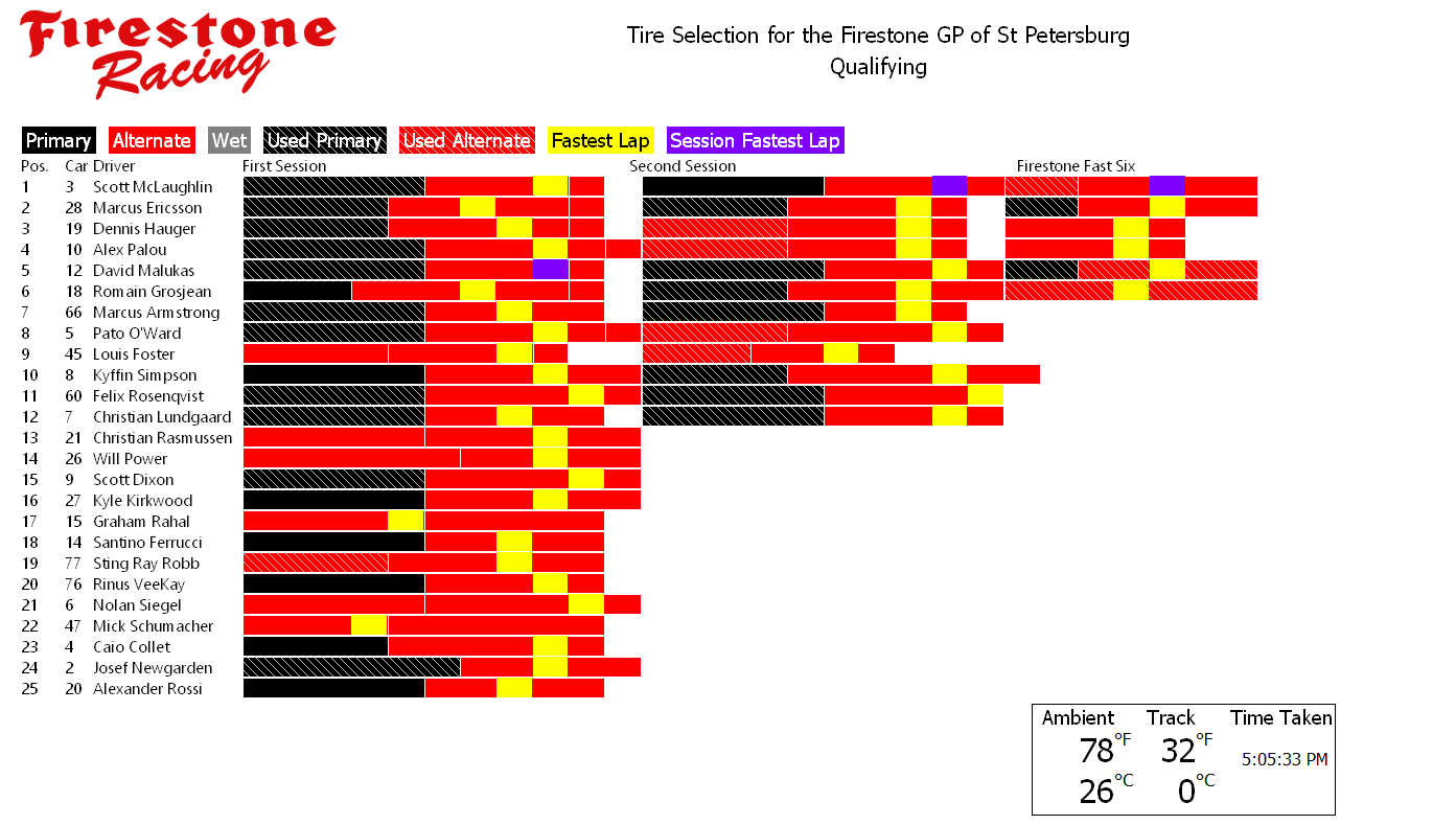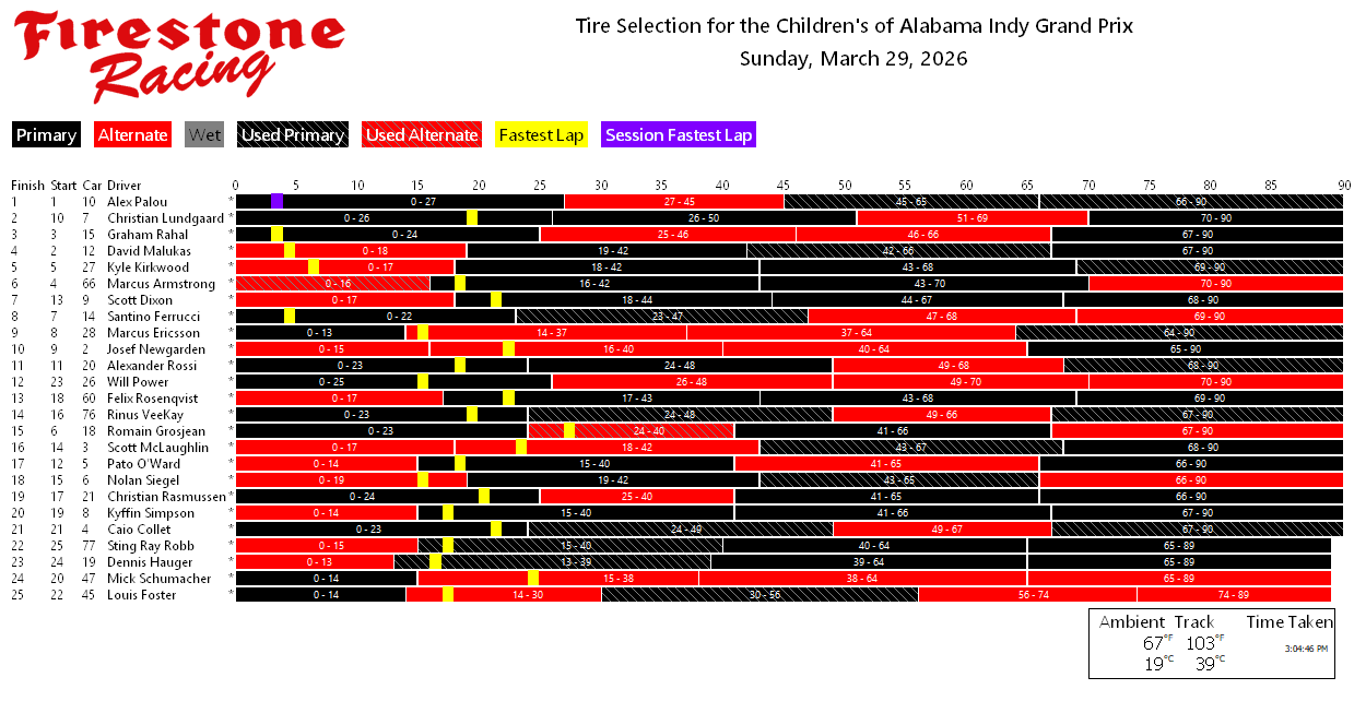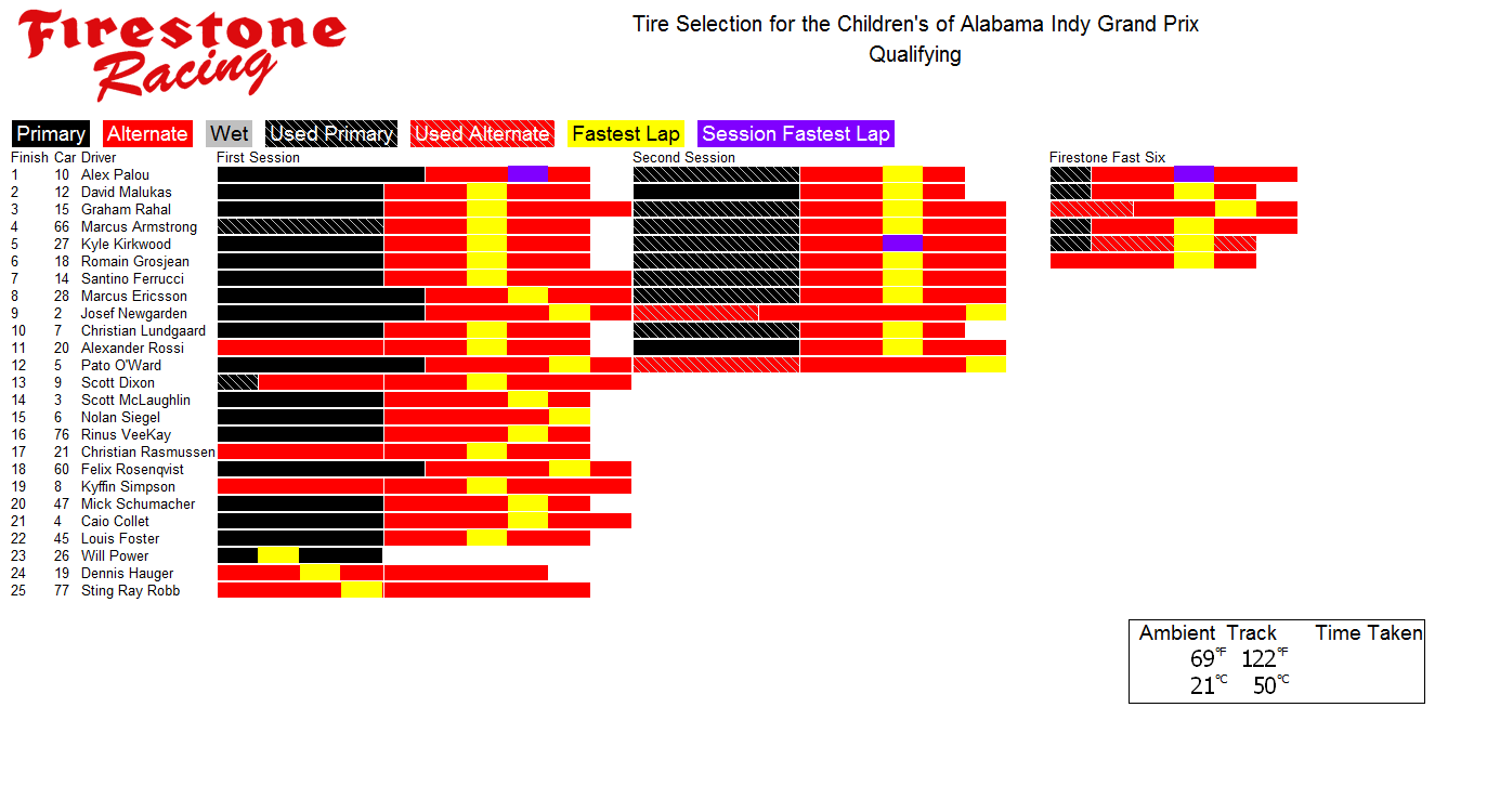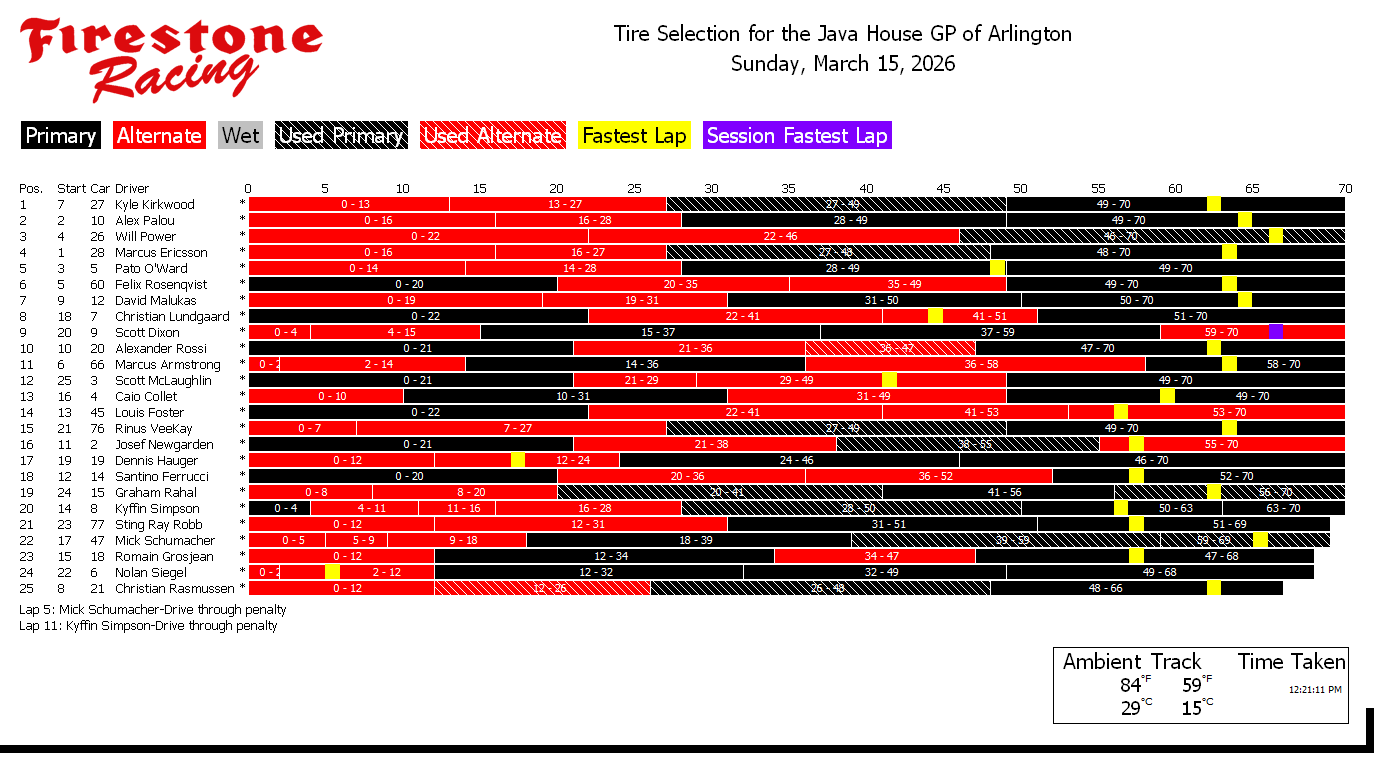 Tire charts produced by PTSC and Firestone for INDYCAR races with alternate tires. With limited exceptions, there are no tire charts for races that only feature one tire compound. Follow along live during the race at livetiming.net/firestone
