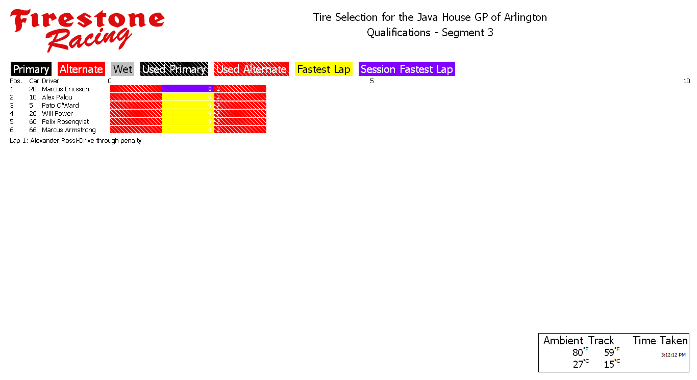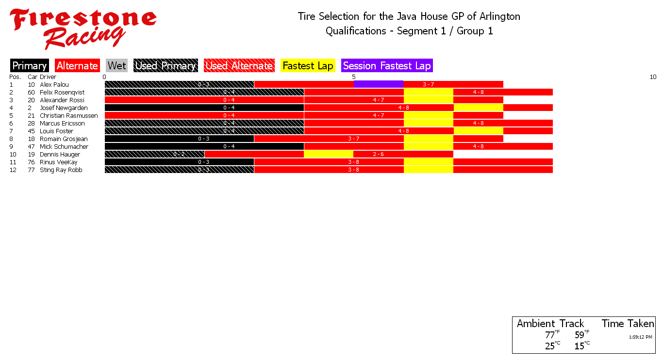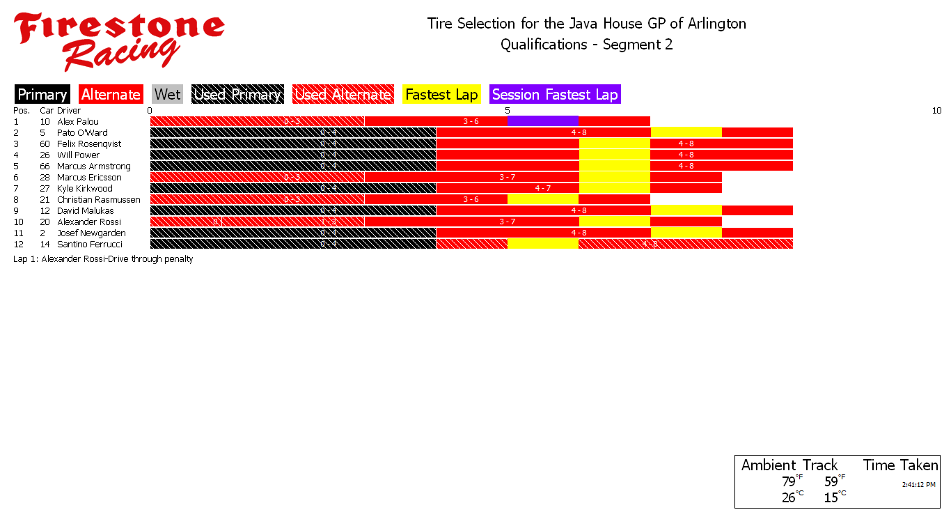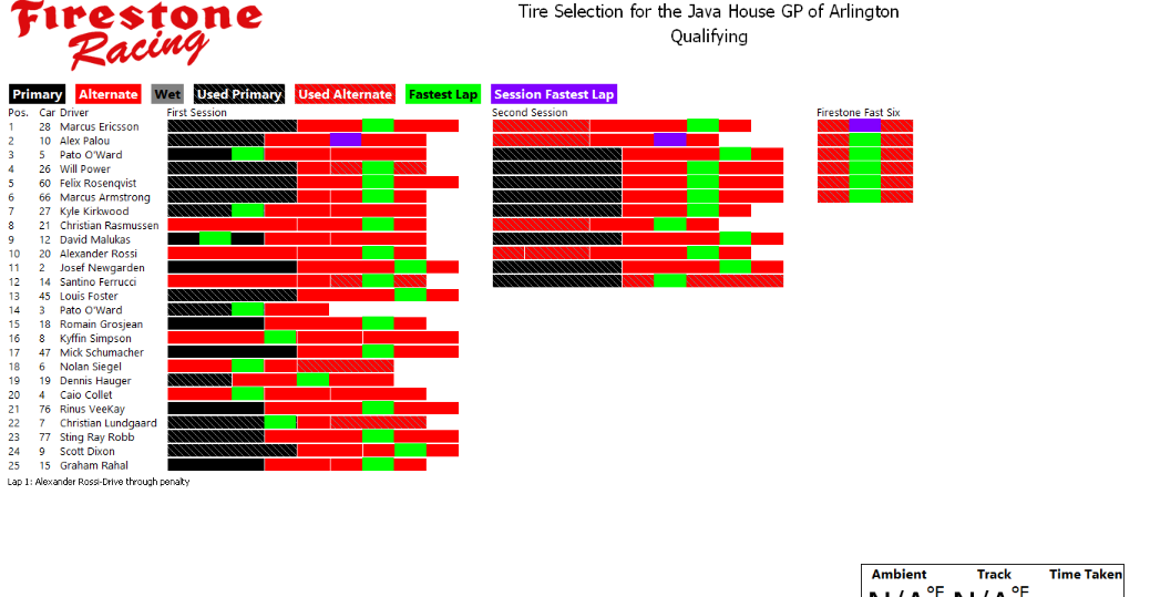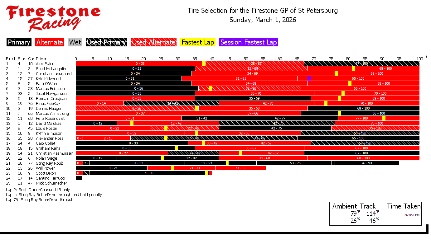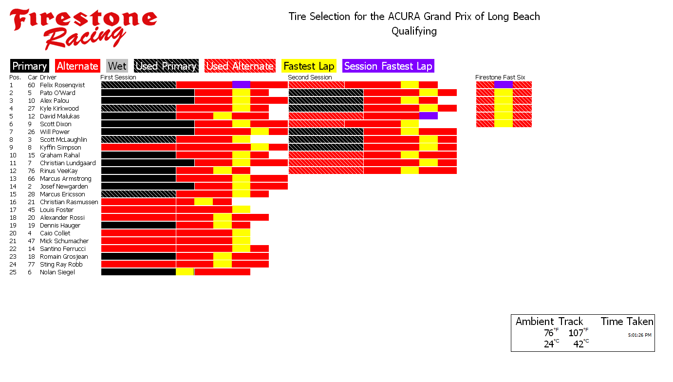 Tire charts produced by PTSC and Firestone for INDYCAR races with alternate tires. With limited exceptions, there are no tire charts for races that only feature one tire compound. Follow along live during the race at livetiming.net/firestone